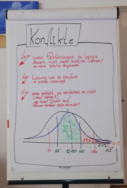 Spontan haben wir die Verteilung der Intelligenz gezeigt. (Ja, die Verteilungskurve ist nicht optimal gelungen und ja, wir haben verstanden, dass die Nachkommazahlen wichtig sind und Rundungen nicht erlaubt…) – Aber hauptsächlich konnten wir den Jugendlichen viel Druck nehmen. Denn durch Verstehen von Unterschieden steigt die Akzeptanz und die Erkenntnis, dass diese normal und richtig sind. Ein Stück weit, war Erleichterung zu spüren.