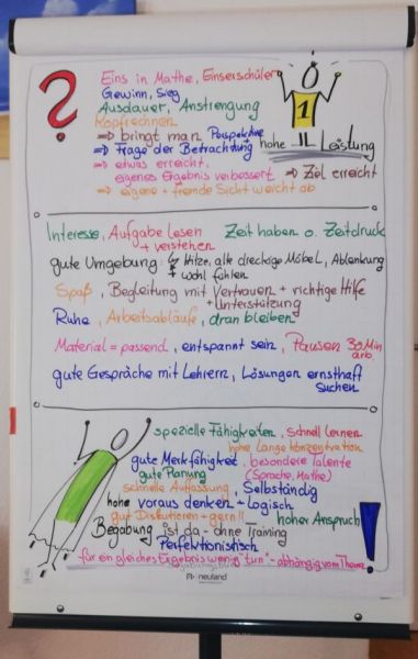 Erst zurückhaltend und dann immer selbstbewusster kamen die Antworten auf die erste Frage. So entstand eine lange Liste, was für die Jugendlichen Hochbegabung ausmacht. Einige Impulse haben wir ergänzend eingebracht und Definitionen aus der Wissenschaft zur Diskussion gestellt. Da war das eine oder andere Aha-Erlebnis in den Augen zu sehen.